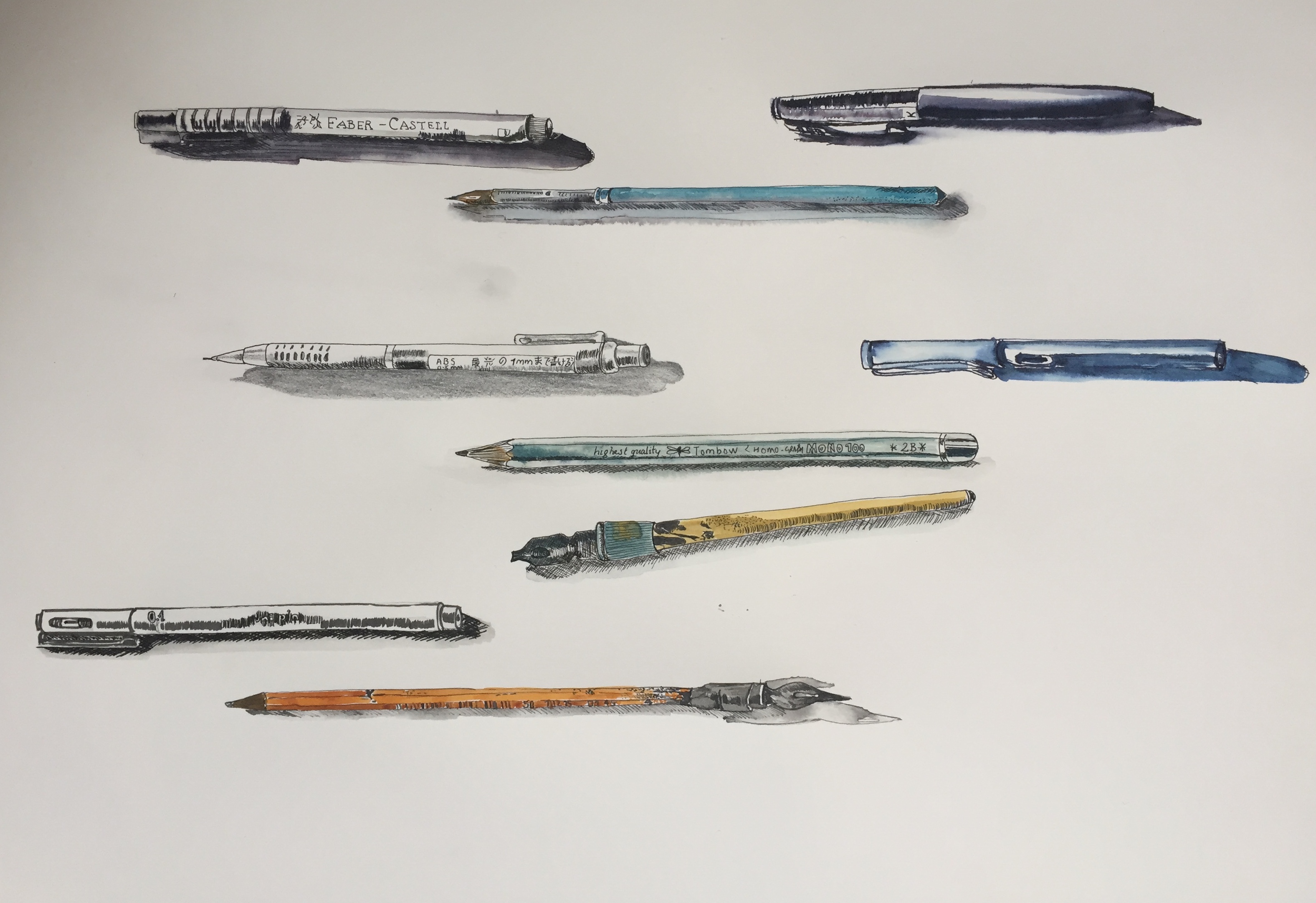 Early posts I made coincided with a short online course I enrolled on for illustration. Having trained in Fine Art, my previous drawing had focused on the observational, striving for accuracy in the representation of the object under scrutiny. The drawing I was encouraged to pursue on this course was the opposite, derived from the imaginary, focused on the fictional but inspired by the factual and experiential aspects of life. The first drawing I made however was an observational drawing of the tools I had available for my future drawing endeavours. This collection of mark making tools included some pens I had not seen since my art school days (fig 2.).