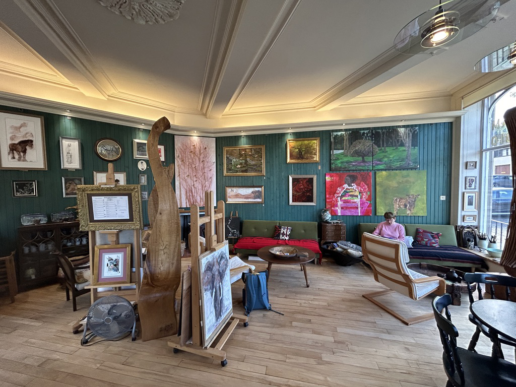 I spent the next morning at the house doing emails before walking down Birnam Glen to the Climate Café event in the old surgery in Little Dunkeld. This was an interesting event focused on land use and nature finance. The discussion surrounded a piece of land next to the river Almond – defined by ecologists as riverwoods. After this, I went to Birnam Arts for a coffee and a piece of cake as they don’t serve lunch Mon-Wed. I then went to Birnam Studio Gallery to do my interview, but Mridula wanted to make it happen on Thursday instead which was fine by me, I was tired. I went back to Birnam Arts for a bit to see the new exhibition and to write some emails in the space. It was busy and I saw another old school friend who was setting up for some fiddle workshops and performances connected with the current exhibition.