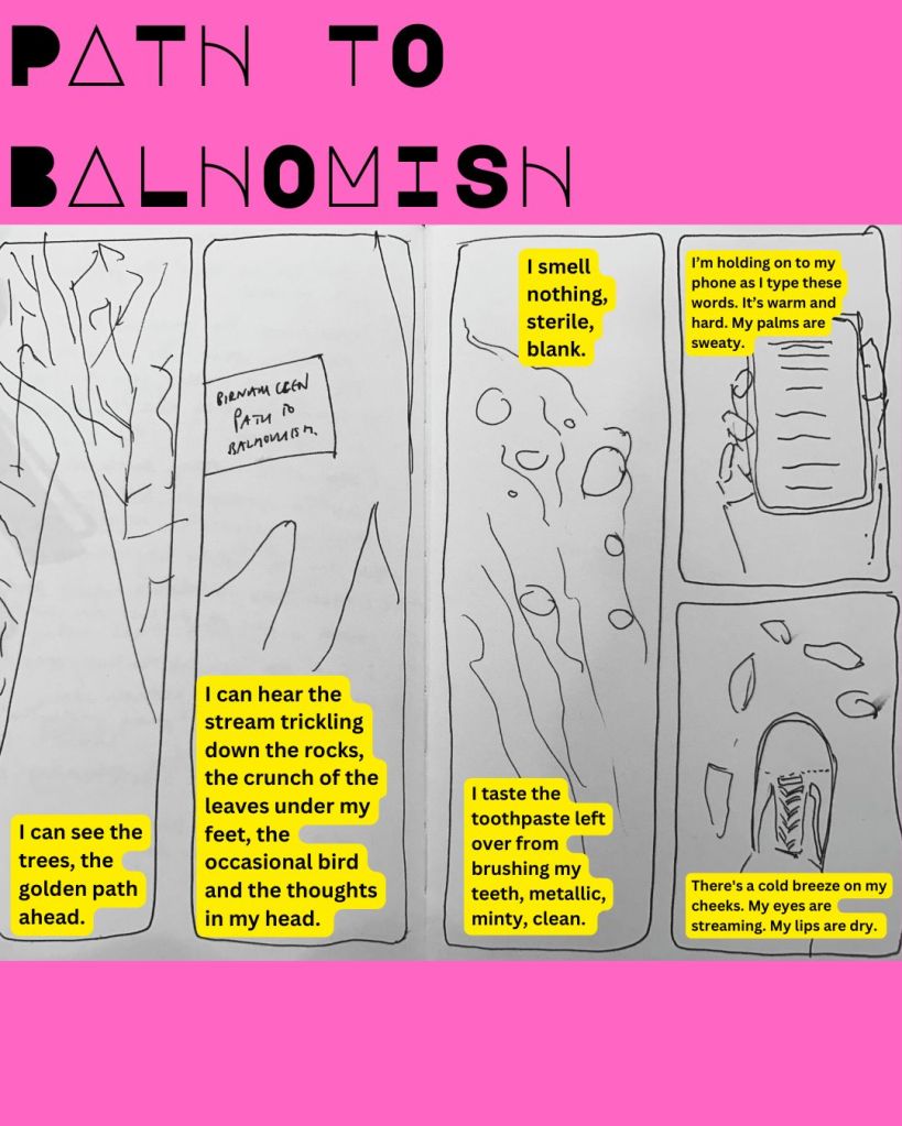My interview with Mridula went well on Thursday. It takes more energy than I remember to do this than I think it will. I felt tired the following day and decided to take a walk towards Balhomish, an old farm which lies in the valley to the right of Birnam Hill. This was a nice way to check in with the landscape around me again and have a break from thinking! I made a quick memory poetry comic but haven’t yet published this to my Instagram.