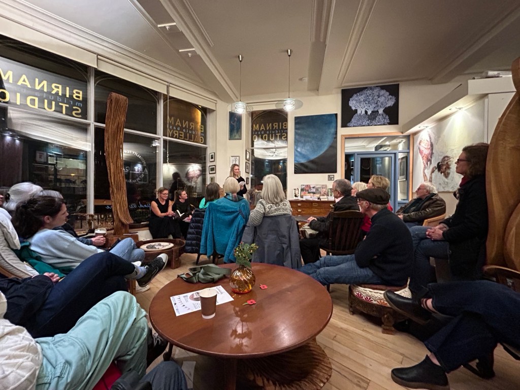 At the weekend, the Birnam Book Festival was on 26-28 October. BA hosted the main events. I attended a fringe poetry event called ‘Poetry of People, Legend and Lore’ on the Friday evening at the Birnam Studio Gallery. This was organised by Morag Anderson who was the Birnam Book Festival’s poet in residence. Julie McNeill and Donna Matthew were also doing readings. The poetry evening was amazing. There were some intense poems spoken. I bought two books: one on the history of women’s football in Scotland, called We are Scottish Football, published by Luath Press, the other was a collection of poems by Donna Matthew, called Remembering Myself. The Birnam Studio Gallery was full. The atmosphere was brilliant. The publisher from Tippermuir books was there from Perth who was nice to meet and chat with briefly. The Corbenic Poetry Path was also featured in the Book Festival website as something to visit which is on the Trochry road in the grounds of the Corbenic Camphill Community. I made a note to go and visit that.