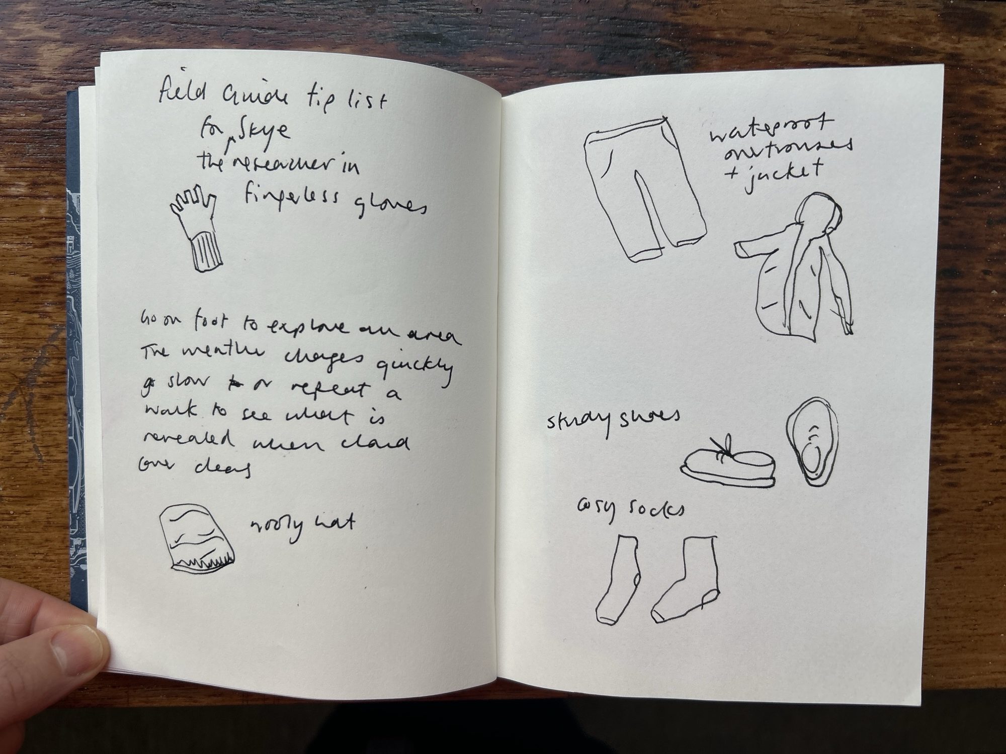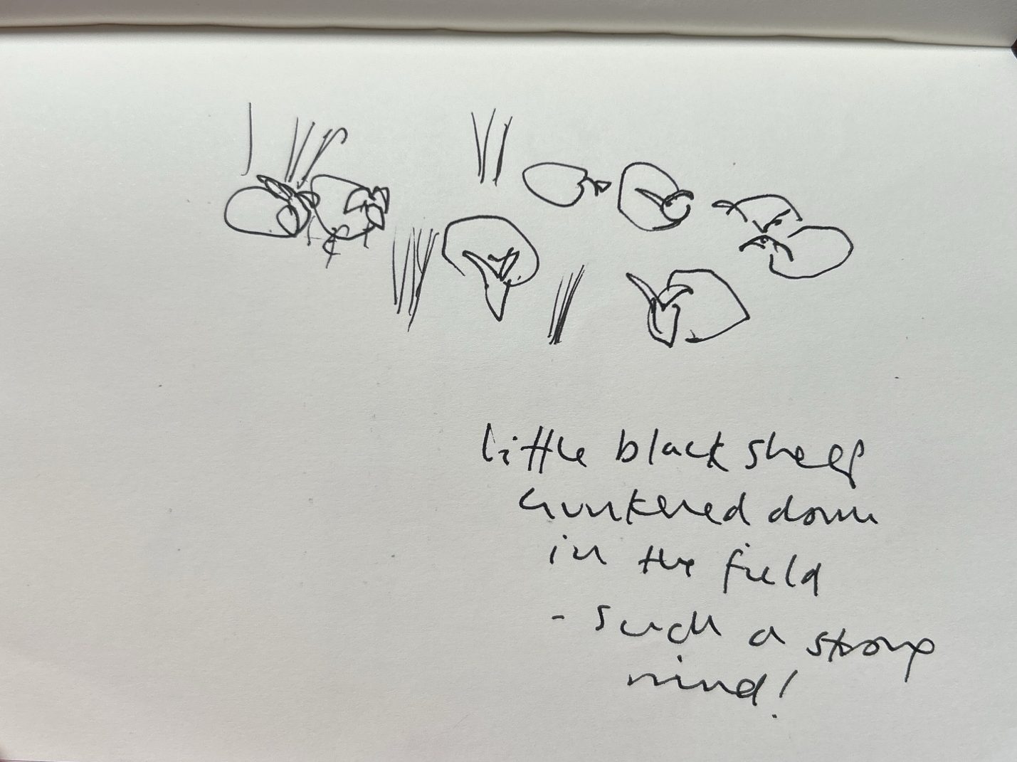 Into the new year 2025, I made my second research trip to the Isle of Skye. This time to stay a bit further north of Portree and Glen Bernisdale (where I stayed in November) in a place called Flashader. I drove through the snow in what was a painfully slow journey. I arrived in the dark but in one piece. My production of Fount increased in pace during this trip, and I wrote the majority of the content in amidst various trips to Portree to interview people for my research and visits to the Skye and Lochalsh Archive Centre. The skies were bright blue on the clear days which were also bitterly cold. I managed to make some sketches during some short walks outside, of the little black sheep hunkered down sheltering from the wind (figure 8) and a ‘Field Guide Tip List for the Researcher in Skye’ (figure 9). One of the tips reads, “Go on foot to explore an area. The weather changes quickly, go slow or repeat a walk to see what is revealed when cloud cover clears”.