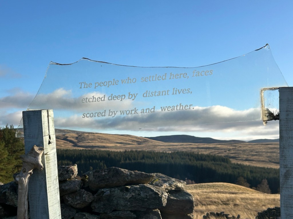 The letters are etched onto the face of a piece of glass, which is a large shard of a shattered pane of glass, mounted on two posts which are positioned next to the ruins of what appear to have been at one time a stone building, a home I think. The view down the valley at the time when that building was in use would have been wonderful to wake up to. I couldn’t help but wonder who lived in that place and when it fell into disrepair.