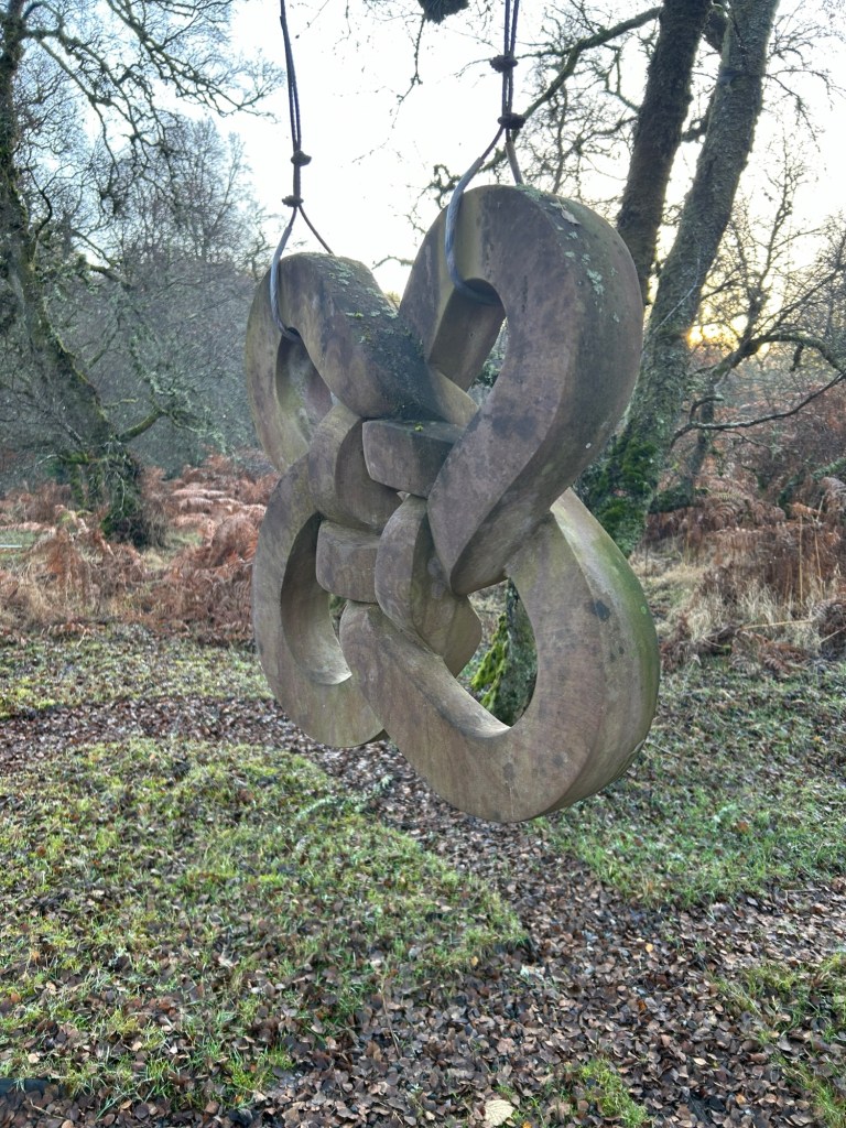 As well as poetry, we encountered an abstract stone sculptural work which reminded me of the canisters storing the ominous looking black liquid in Ridley Scott’s 2012 film Prometheus. When viewing the sculpture, this notional idea of the seed and the potential for life inside it came through to me (figure 2). The sculpture was carved to an exacting geometry with a rough edge on the outside and the inside smoothed to a fine polish (see figure 3). Another stone sculpture, a carved Gaelic knot, was suspended from trees in the woods. In a moment looking up close at the stone sculpture then beginning to walk away I realized that the same Gaelic knot was somehow inscribed in the ground below us (figures 4 and 5).