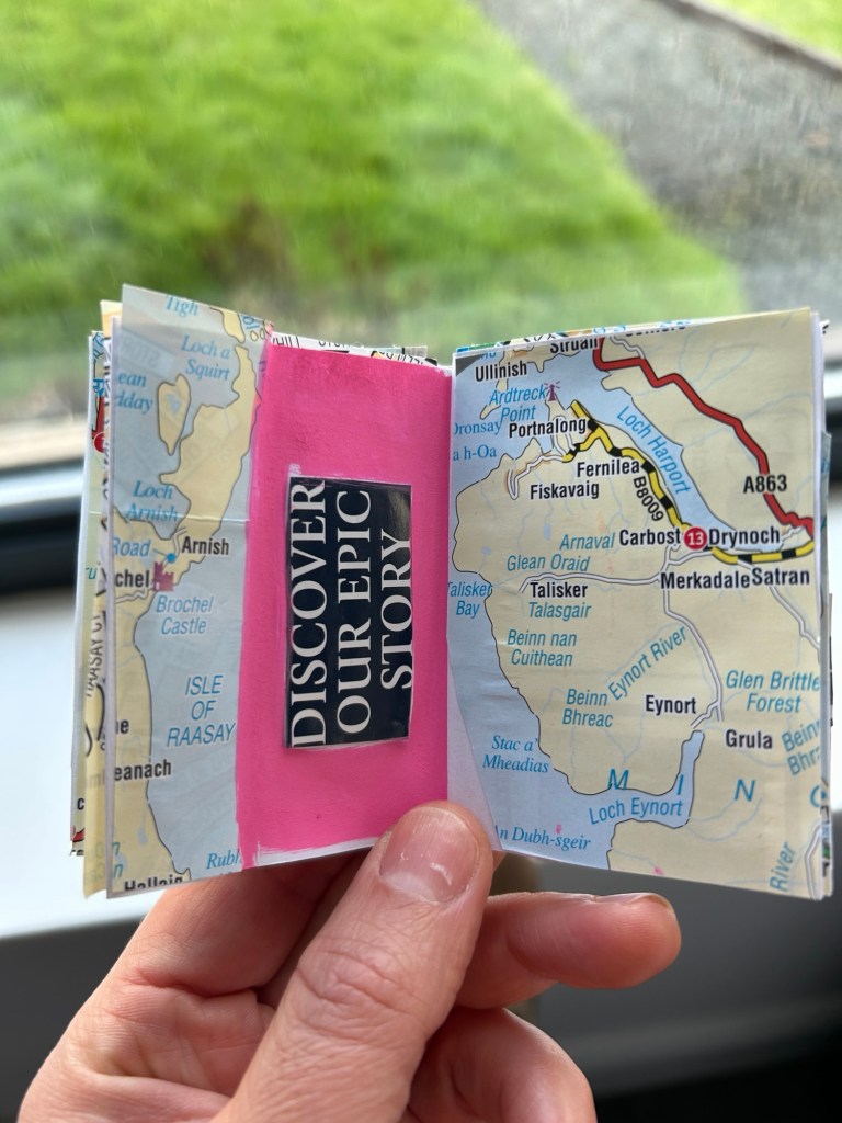 To help get my bearings I explored Portree on foot. The visitor information office was open. I found helpful maps and leaflets there advertising boat trips, artist studios around the island, walks to do and some historical information. Hidden Scotland is a publication I discovered which has useful information intended for the visitor to Scotland of local shops and places to eat and stay. I took the leaflets I had gathered and made a pocket sized zine simply titled ‘The Isle of Skye’ (figures 6 & 7). Making this zine helped me to focus on the details of the map, and familiarize myself with the place names. In amongst talking with the team at Atlas Arts, the central arts organization of my case study here in Skye, I was also beginning to draft my first issue of Fount magazine for this project – which is looking set to be printed any day in this month of March 2025 and should be available to download from this website soon!