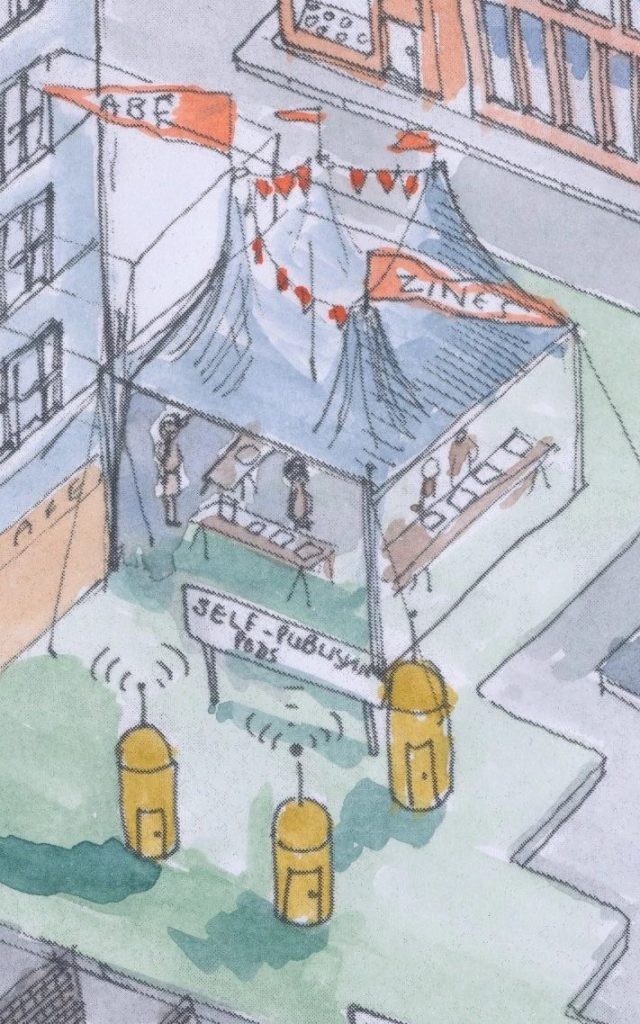 Research Town (the drawing above) depicts a place derived from my research explorations into publishing and self-publishing activity within the visual arts where the streets are named after notable elements of activity in this area of art-publishing: Comic Crescent, Instagram Way, Printing Works Way, Press St, Pamphlet Place, Postcard Port, Zine St, and Intermedia Alley. Postcard Port alludes to there being more of these towns elsewhere, a connection to other networks of similar kinds of activities (or different). The streets are connected amongst buildings of use for the town’s inhabitants and sections of the town where certain types of work might go on. The artist book fair (ABF) is represented by the tent structure sitting next to the studios block, signified by the flag with ABF on it and characterised as a fair by the bunting draped across the tops of the tent poles. Comic Crescent is envisaged as a row of semi-detached Victorian villas, reflecting to a degree, although not for certain in the same architectural spaces, where a lot of comic making happens, in comic maker’s houses. Intermedia Alley reflects the mix of mediums, formats of paper books, e-books for example, and types of media involved in activities in this area, for example, film, press articles, etc. Zine St. and Pamphlet Place reflect the print culture happening here too. Alongside Postcard Port, these street names reflect the zine, pamphlet and postcard publications that are often ephemeral, momentary and less long-lived than their counterpart publications in Research Town, which may be housed in the library, or art gallery buildings. Of course socialising in an important part of Research Town and the bagel and coffee shops as well as the cinema and the rare book shop aim to reflect the importance of the mix of socialising and entertainment with specialist interests in book history, art, film and cinema for the inhabitants of this town.